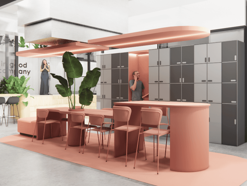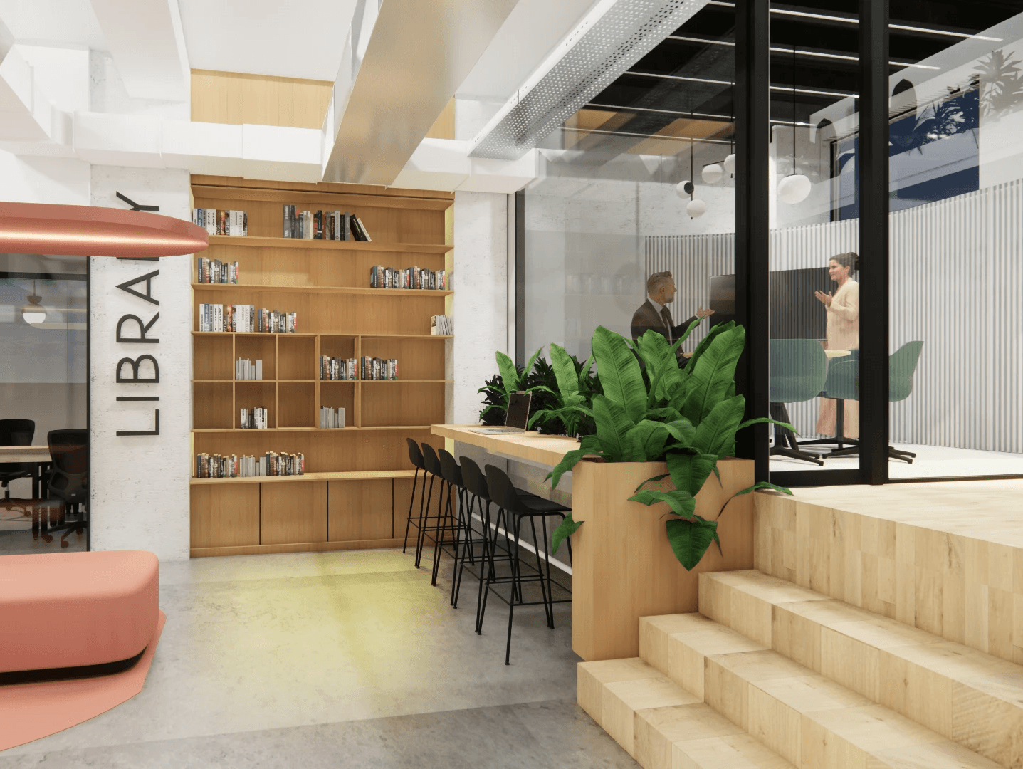 The scheme introduces multiple zones, like a library space, a custom conceptual table, both small and large meeting rooms, and alternative seating for calls outside enclosed cabins—to support different ways of working.