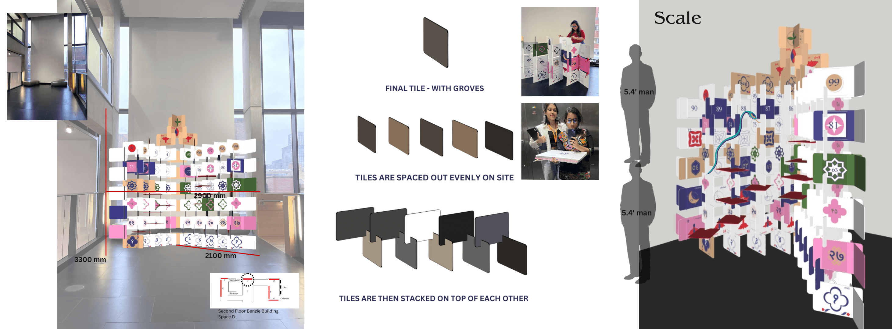 The final installation stood as a walkable, layered artwork that merged tradition with technology. An XR experience was integrated through a QR code, where visitors could view animated snakes hovering above the structure, blending Sneha’s graphic design with Niveditta’s spatial composition.
