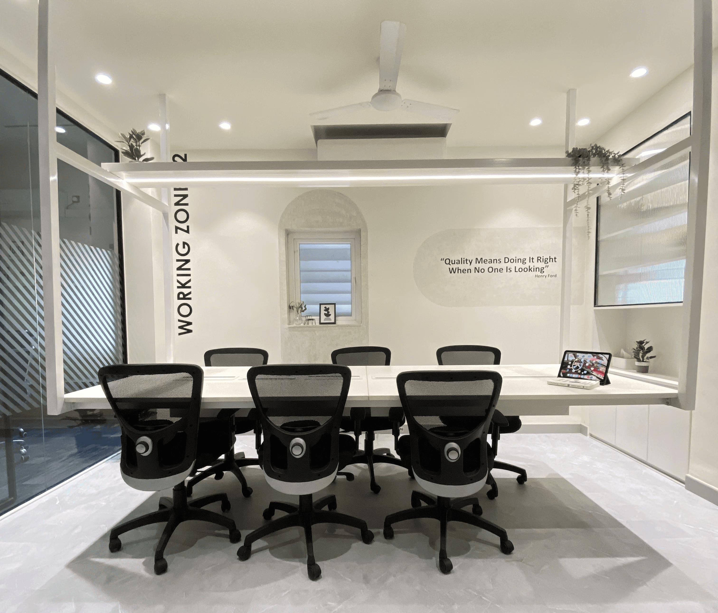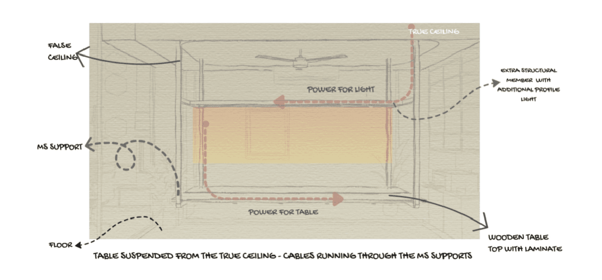 Rather than placing cables on the floor, I explored the idea of suspending them from the ceiling, allowing power access without invasive groundwork. The false ceiling became the channel for running cables neatly and invisibly.