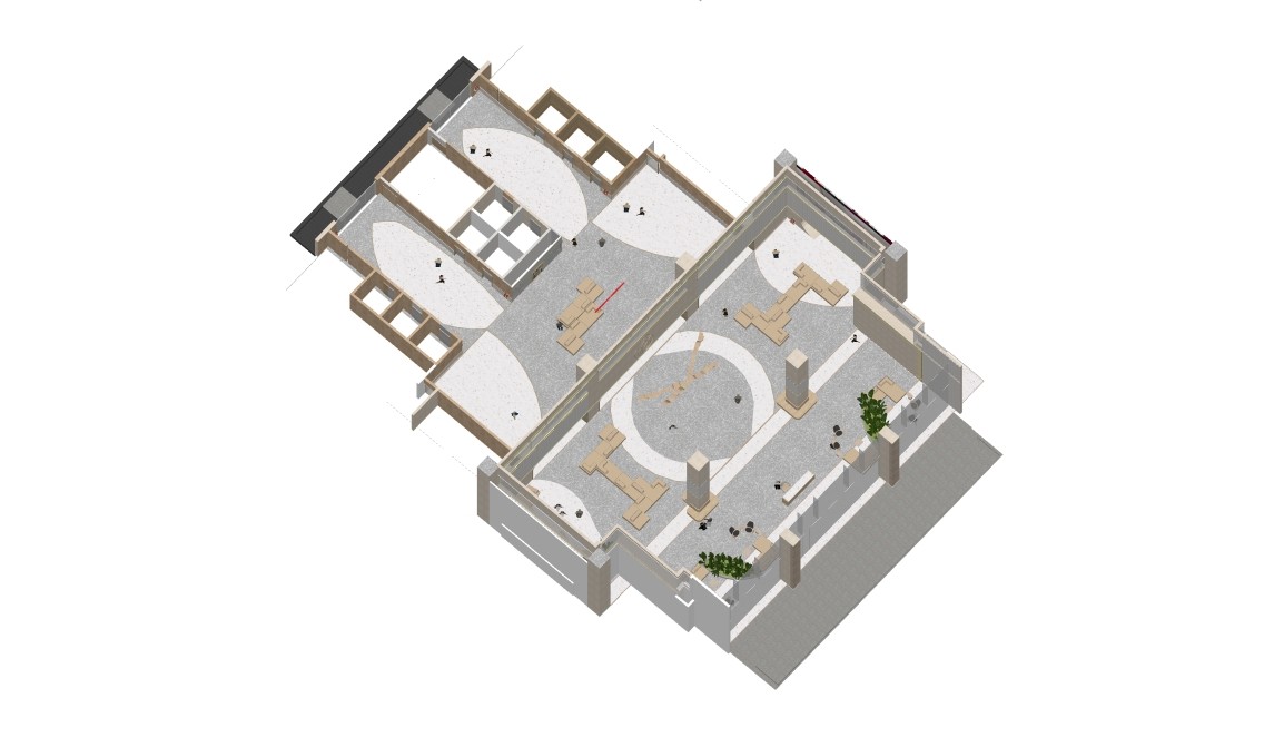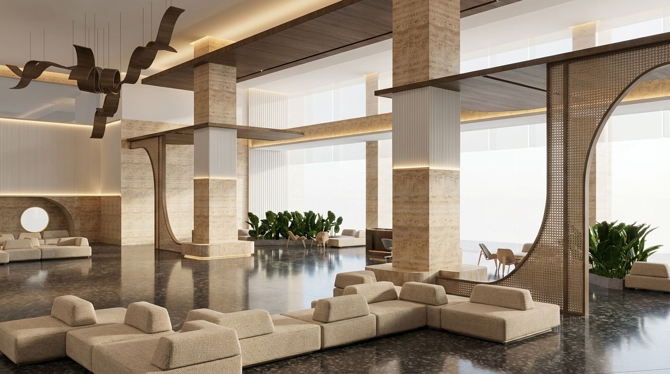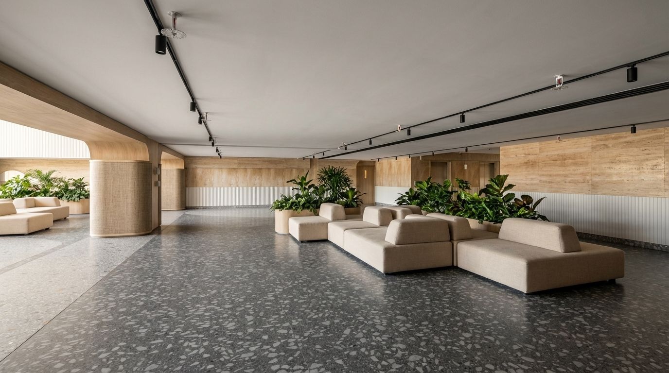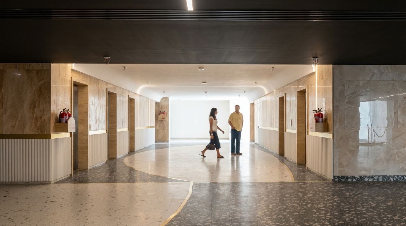 Navigating the contrast in heights between the lobby and the compact lift area posed a unique challenge. The design evolved to guide the visitor’s gaze naturally through these varying volumes, ensuring visual continuity without overpowering the smaller zones.