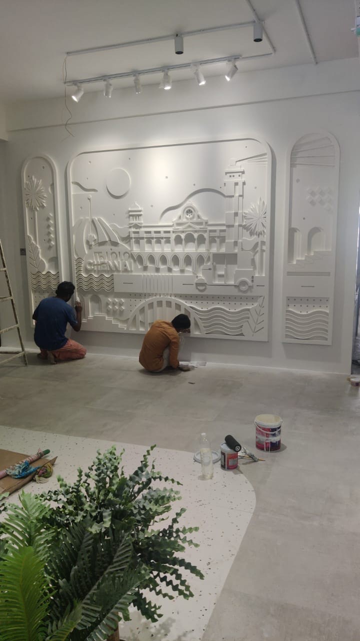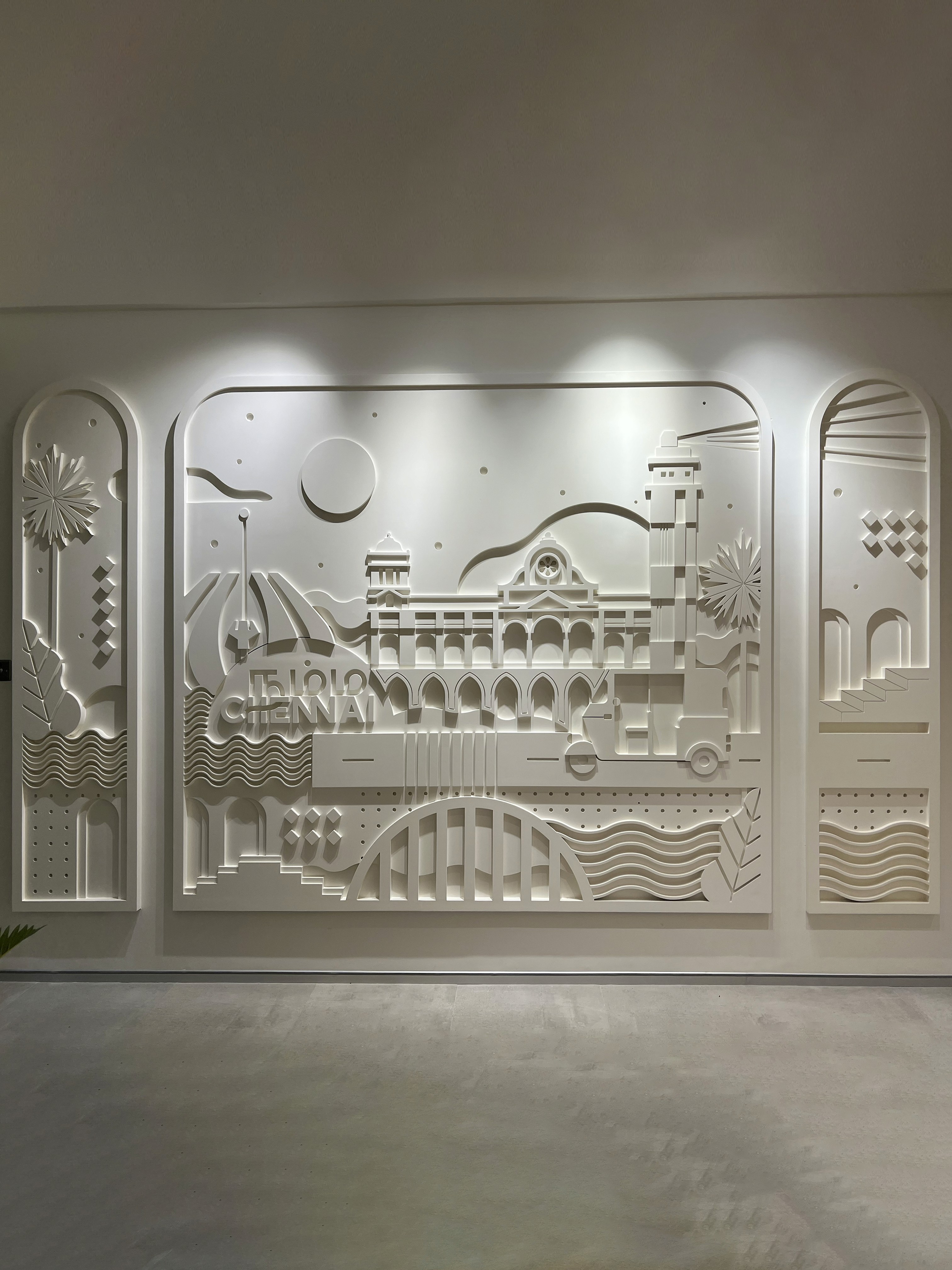 This project was in collaboration with Aloka Design Studio and Ajit, an artist and mural curator, we transformed this entrance wall into a canvas. The mural was designed to capture the spirit of Chennai in an abstract, eye-catching way, without the use of words.