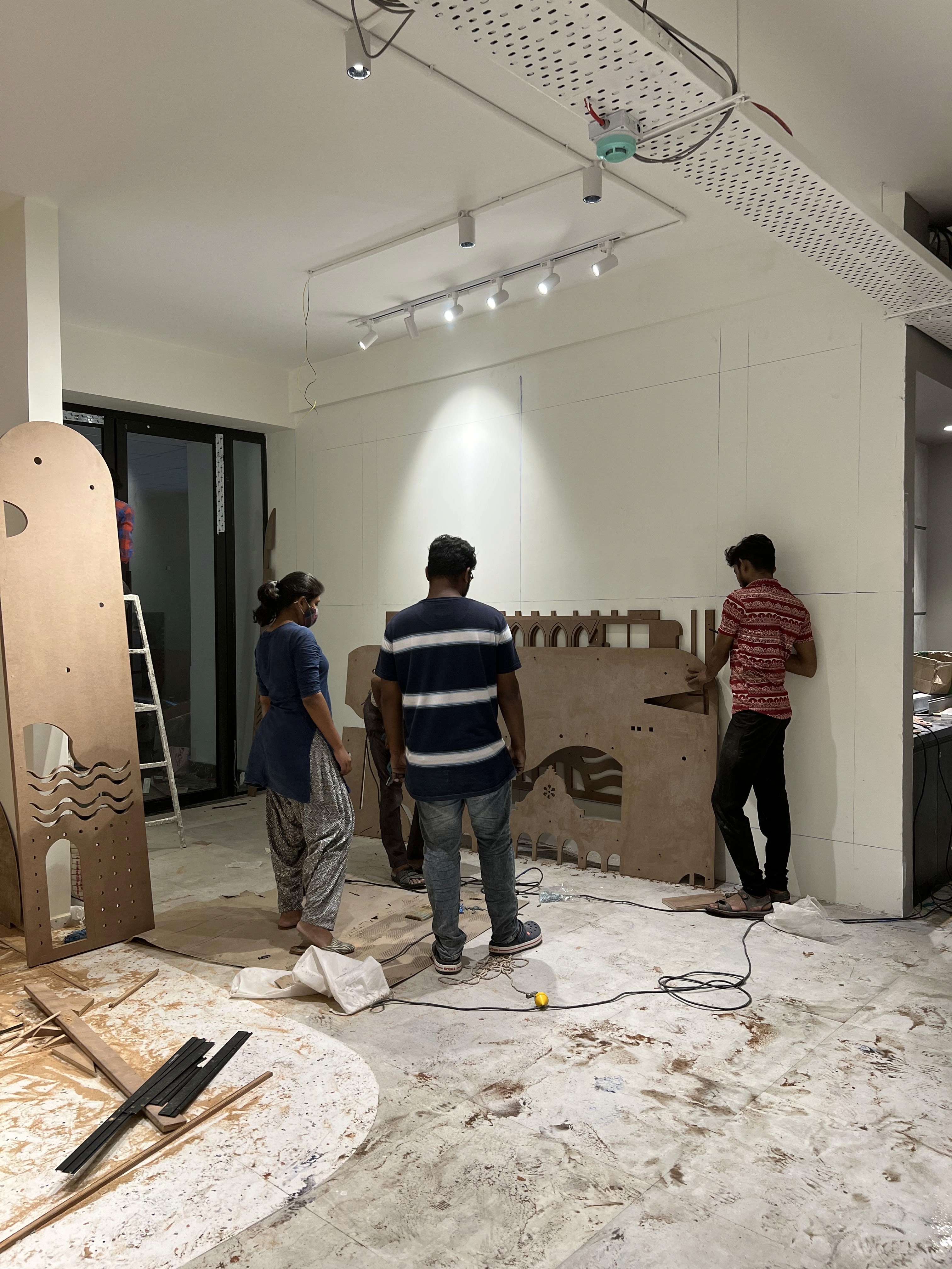The design was inspired by arches, a recurring feature across the space. The artwork (10 ft x 14 ft) was broken into smaller modules using CAD, then cut on MDF boards with a CNC machine. On-site, the pieces were assembled like a puzzle, glued and screwed onto the wall. By layering components across five levels, the artwork created a sense of depth and visual movement. Finally, PU painting and lighting added depth, perfectly proportioned for the space.
