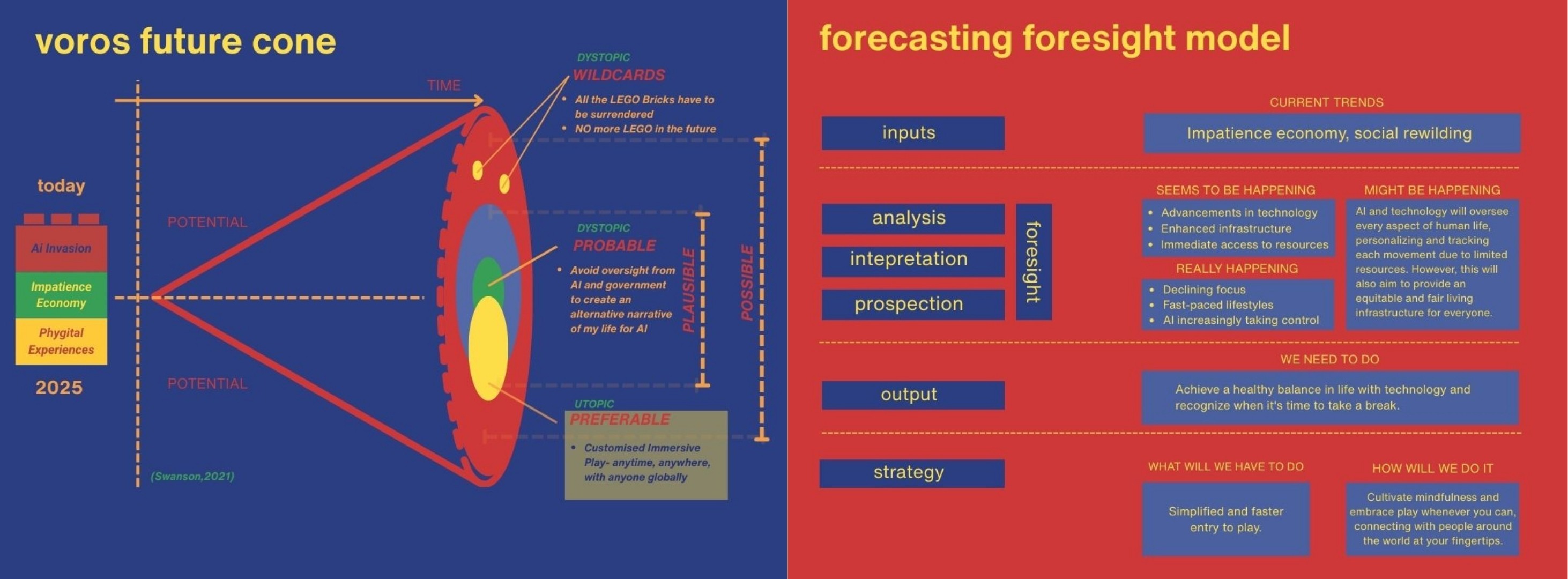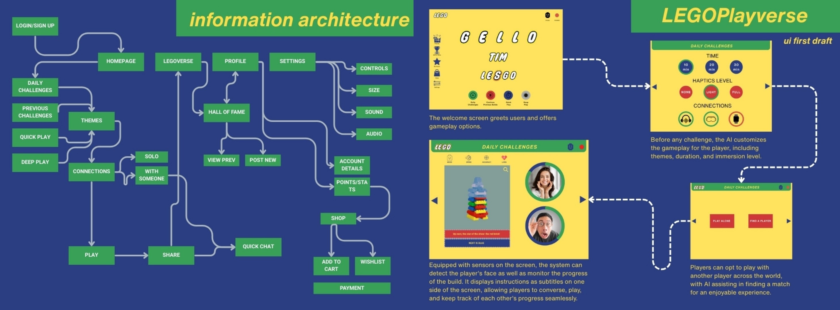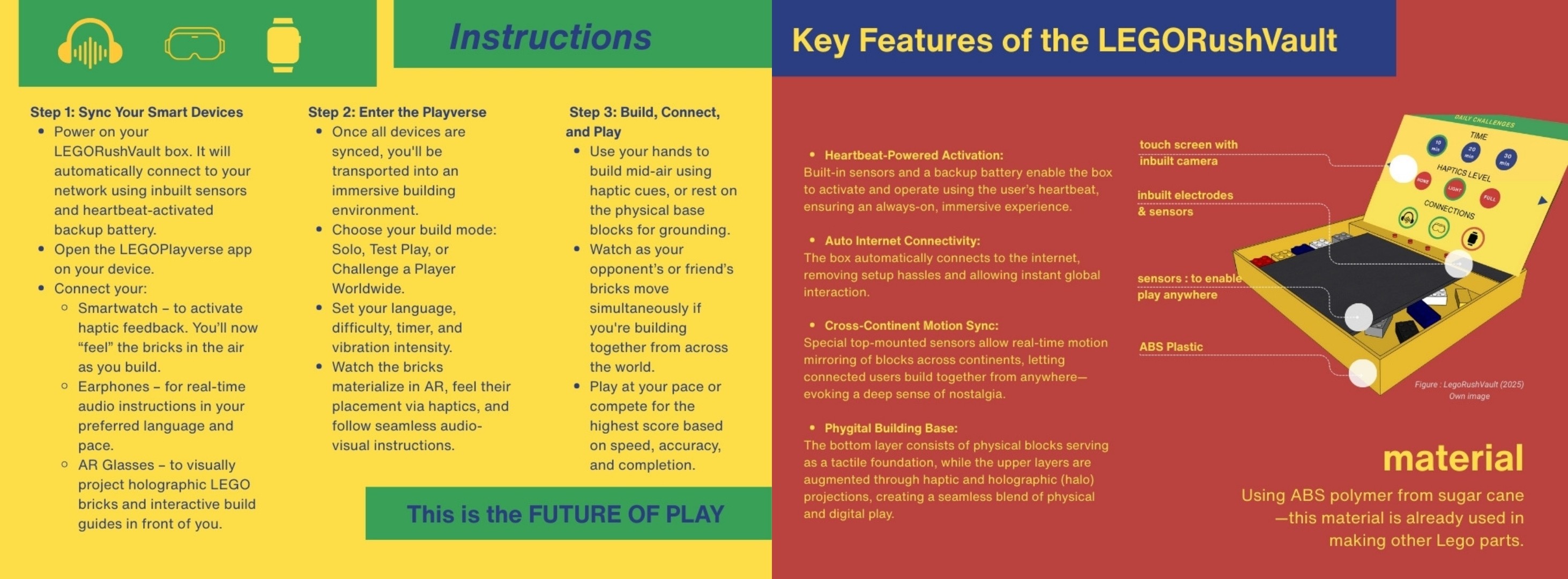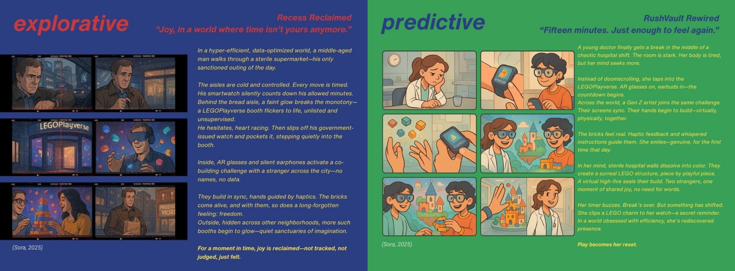 The outcome evolved from installation studies into LEGO RushVault, a “phygital” ecosystem where users build, scan, and unlock short digital story prompts. Modular prototypes explored material tactility, recycled plastics while AR overlays added narrative layers without overwhelming the experience.