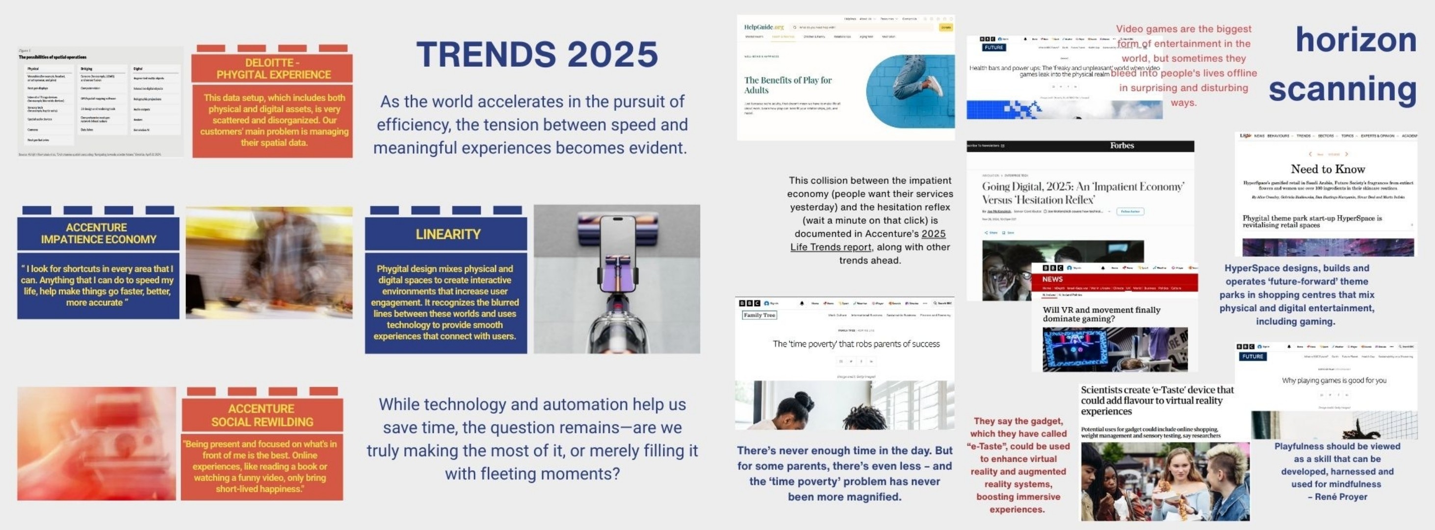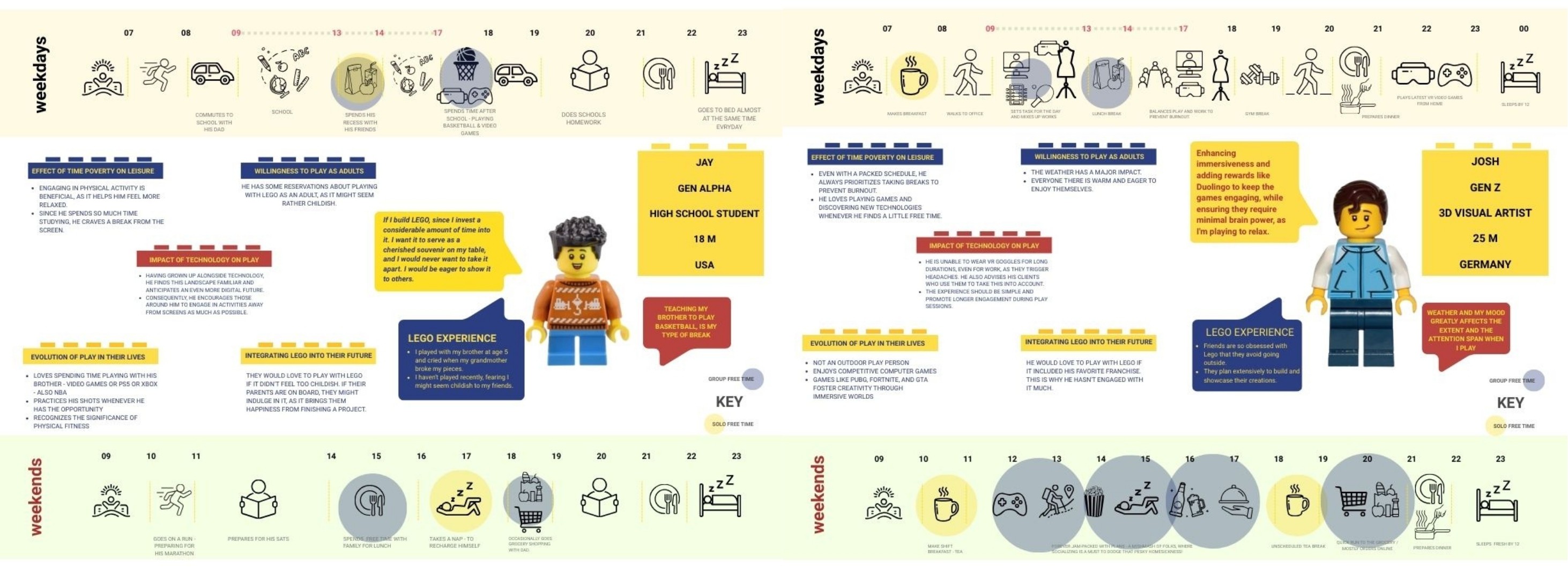 I conducted empathy mapping, interviews, and behavioral probes to identify emotional barriers to play, including time pressure, digital fatigue, and self-judgment. Combined with trend analysis, these insights led me to explore the idea of phygital play as a bridge between tangible and digital creativity.