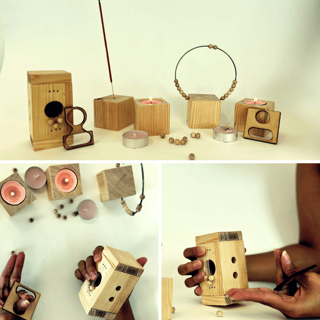 Wellness doesn’t need to be grand or ornamental. Small tactile pauses, the feel of wood grain, could subtly trigger grounding. The synthesis centered on designing an object that feels familiar yet demands presence. The final prototype became a modular sensory artefact, part diffuser, part sculpture by using natural texture in muted tones. Every cut was intentional, inviting touch, scent, and breath.