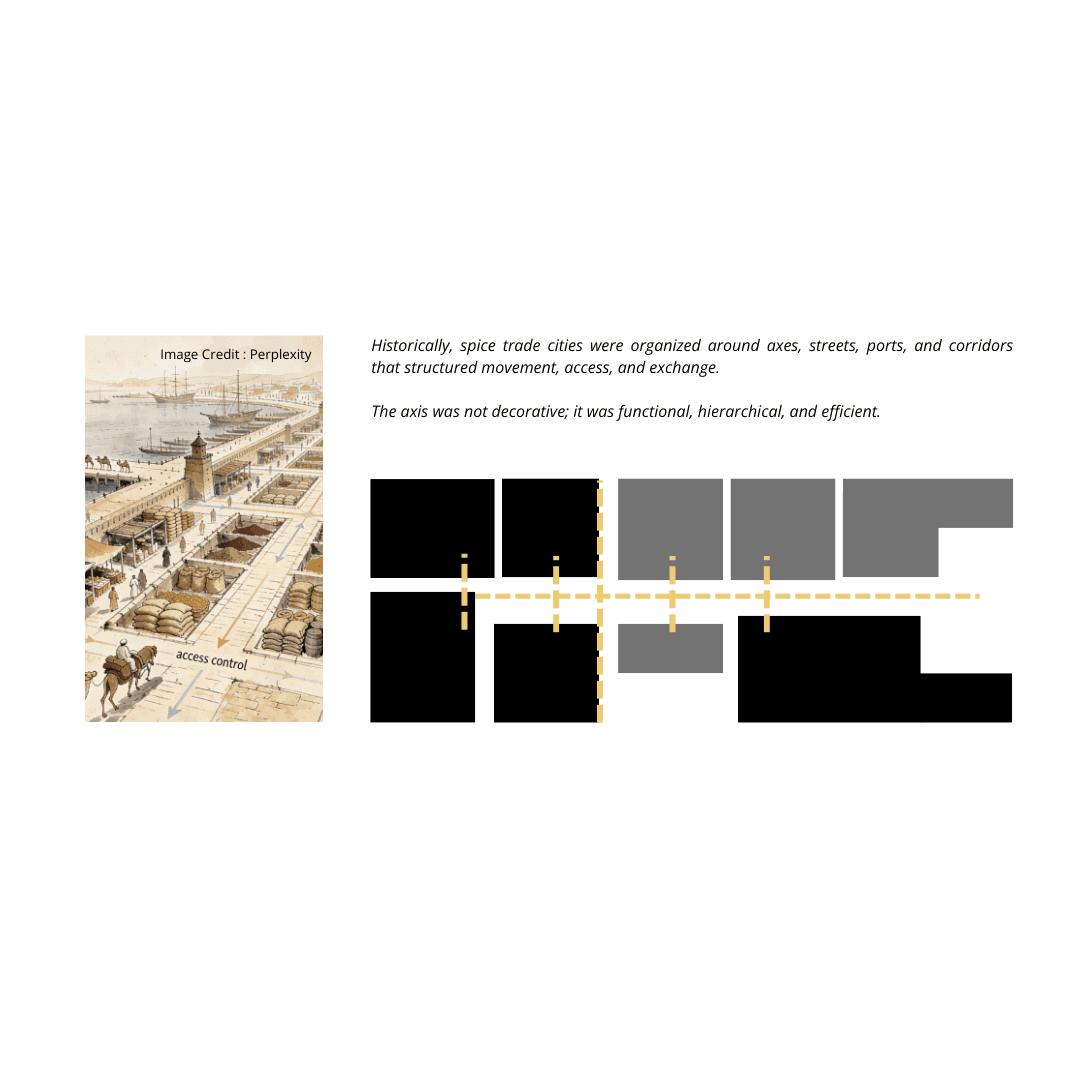 Historically, spice trade cities were organized around axes, streets, ports, and corridors that structured movement, access, and exchange. The axis was not decorative; it was functional, hierarchical, and efficient.